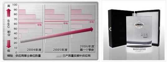 日產(chǎn)汽車每年利用供應(yīng)商計(jì)分卡對(duì)各供應(yīng)商進(jìn)行評(píng)估,并作為供應(yīng)商整體內(nèi)容進(jìn)行總結(jié)。每年供應(yīng)商的整體平均指數(shù)均上升。各供應(yīng)商現(xiàn)在的位置將被報(bào)告,排位靠前的供應(yīng)商也被表彰。