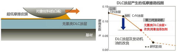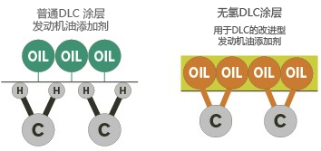 通過采用無氫類氫DLC涂層,提高了與潤滑油的結(jié)合性,同時通過對機油添加劑的改良,形成堅固的超低摩擦皮膜。